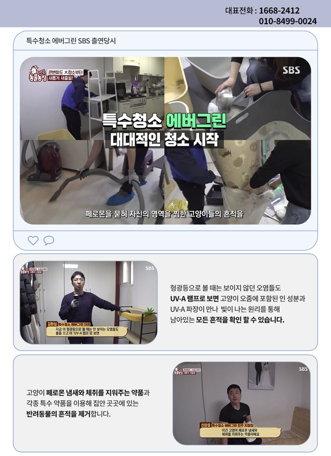 에버그린은 기존의 청소 방식을 뛰어넘는 혁신적인 세정 시스템을 구축하고 있습니다. 일본, 독일, 미국에서 개발된 고성능 세정액을 활용하여 기존 방식으로는 처리가 불가능했던 고착성 오염, 그을음, 중증 악취 등을 과학적으로 제거합니다. 첨단 스팀 시스템과 글라인딩 기술이 융합된 독자적인 작업 프로세스로 공간의 근본적인 청정도를 확보합니다. 주요 방송 매체에서 특수청소 분야의 전문성을 높이 평가받았습니다. SBS '그것이 알고싶다'에서는 고령화 시대의 사회적 과제인 고독사 현상과 현대인의 정신건강 문제로 증가하는 쓰레기집 현상에 대한 전문가적 식견을 제시했으며, SBS '동물농장'에서는 반려동물 전문 청소 역량을 인정받아 페르몬 제거, 배설물 처리, 털 제거, 악취 중화 등의 특수 기술을 선보였습니다.