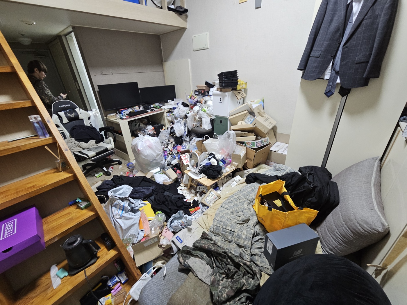 현장에 방문했을 때, 고객님께서는 "너무 부끄럽다"며 고개를 들지 못하셨습니다. 현관 입구부터 쌓인 배달 용기와 생활 쓰레기들이 복층 계단 앞까지 가로막고 있어 이동조차 쉽지 않은 상황이었습니다.