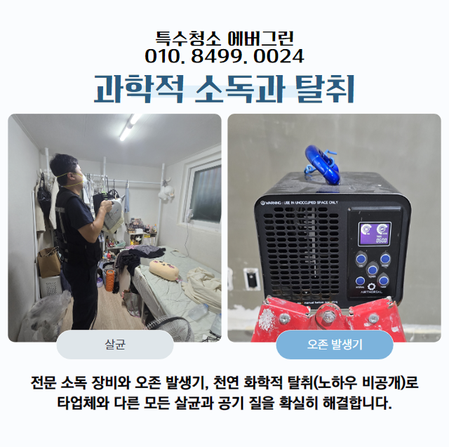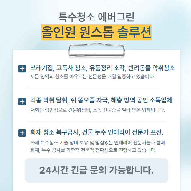 저희 특수청소 에버그린은 고객님의 상황을 이해하고 최적의 해결책을 제시합니다. 화재 복구, 누수 현장 복구가 필요한 경우에는 전문 인테리어 시공팀과 협력하여 원스톱 서비스를 제공합니다. 서울, 인천, 경기도를 비롯한 전국 어디든 달려가 여러분의 공간을 새롭게 변화시켜 드립니다. 쾌적한 주거 환경을 위해 전문가의 도움이 필요하시다면 언제든 특수청소 에버그린이 함께하겠습니다. 여러분의 소중한 공간이 새로운 시작을 맞이할 수 있도록, 정성을 다해 도와드리겠습니다. 깨끗한 환경에서 시작하는 새로운 삶, 특수청소 에버그린이 함께 만들어가겠습니다.