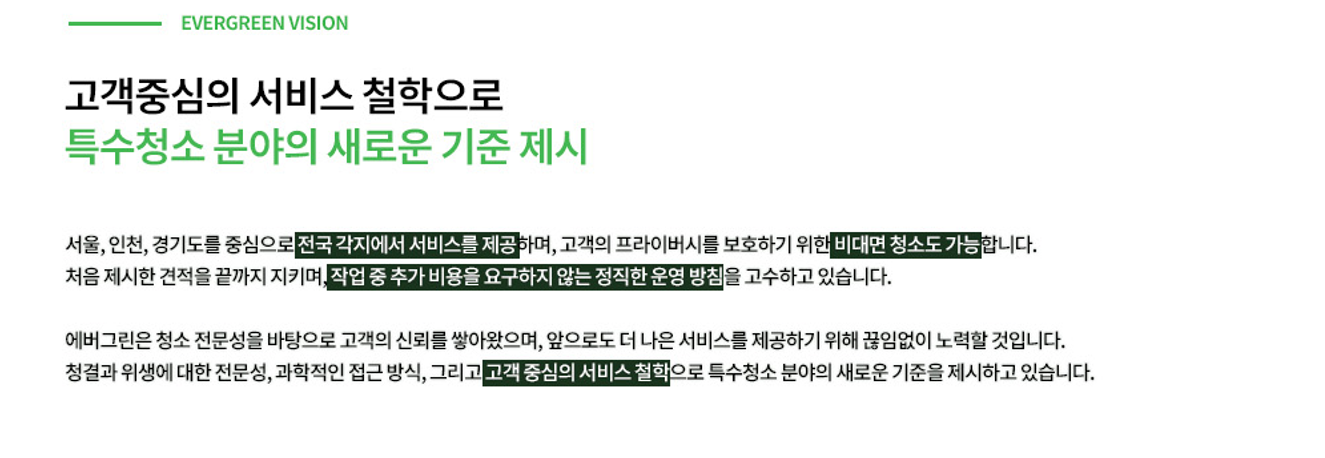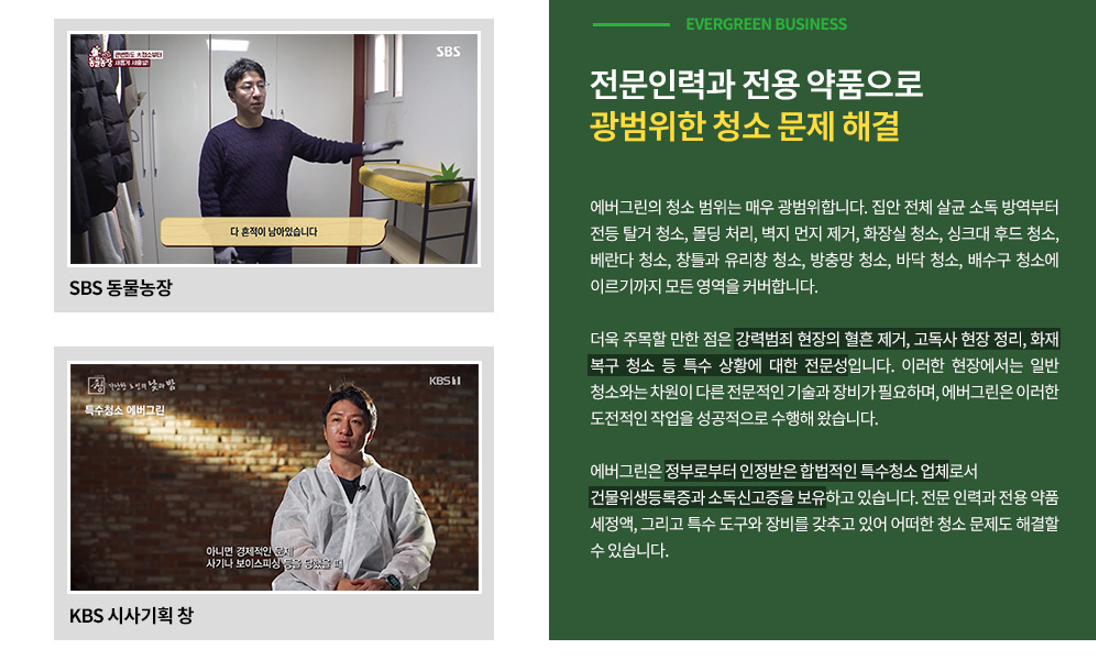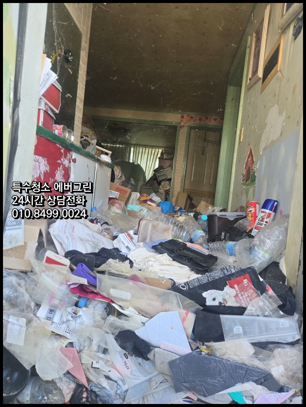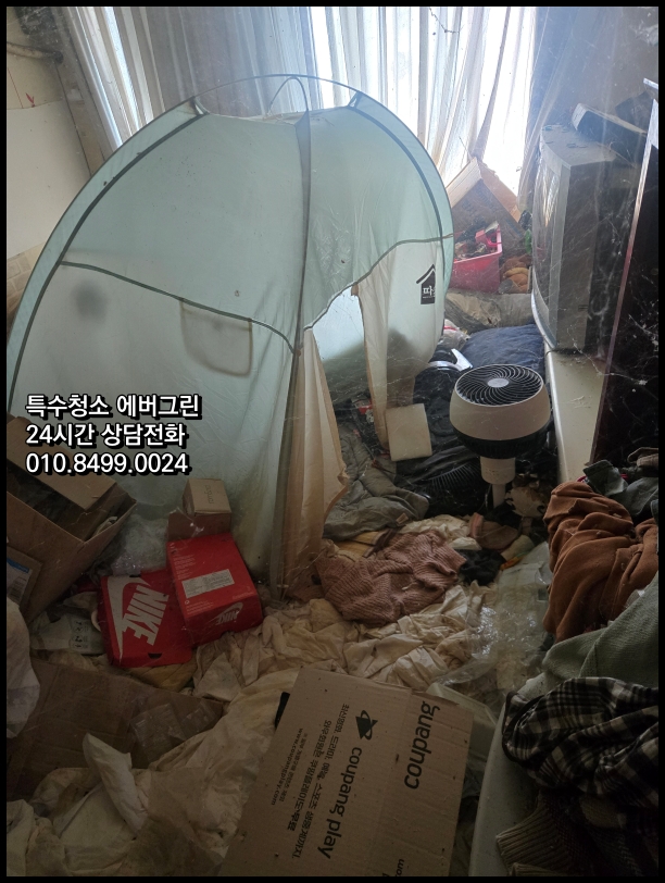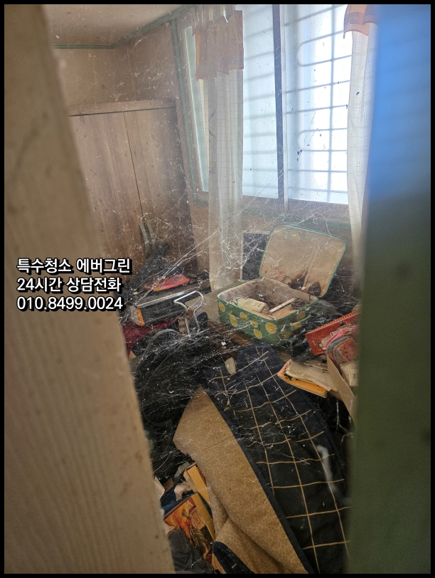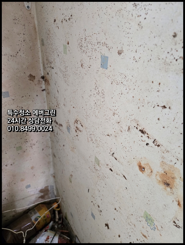 최근 완료된 24평 아파트 현장은 처리가 시급한 상황이었습니다. 실내 곳곳에 종이박스와 일회용품이 가득했으며, 거미줄로 뒤덮인 공간은 각 방문 앞까지 쓰레기가 적치되어 이동이 제한적이었습니다. 정밀 조사 결과 벽지는 곰팡이로 심하게 훼손되었고, 장판 역시 교체가 필요한 상태였습니다. 청소 과정에서 쓰레기층 아래에서 발견된 반려동물 배설물은 추가적인 위생 문제를 야기하고 있었으며, 이와 같은 다층적 오염 상태는 전문적 처리를 요구했습니다. 이러한 전문성이 필요한 현장을 위해 에버그린은 세계적 기술을 도입했습니다. 일본, 독일, 미국의 고급 세정액을 활용한 과학적 청소 방식을 적용하며, 스팀 세척과 글라인드 기술로 완벽한 얼룩 제거를 실현합니다. 특히 탄 자국, 그을음, 악취 제거에서 뛰어난 성과를 보이며, 반려동물 관련 페르몬, 배설물, 털 처리도 체계적으로 진행합니다. 현장 상황에 따라 청소부터 리모델링까지 통합 서비스를 구현하며, 화재 현장, 고독사, 누수 피해 등 특수 상황에서도 고객 만족을 이끌어내고 있습니다.