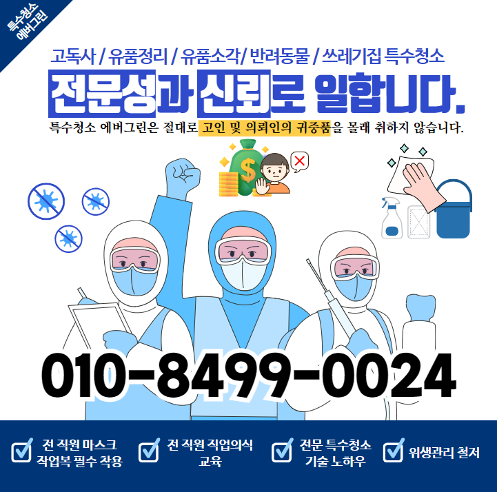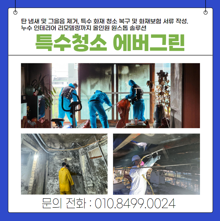 저희는 눈에 보이는 오염물질 제거뿐만 아니라 눈에 보이지 않는 세균과 바이러스까지 제거하여 철저한 환경 관리를 수행합니다. 악취 제거와 해충 방역 서비스도 제공하여 종합적인 환경 개선 솔루션을 제공합니다. 특히 화재 복구 상황에서는 이지화재복구와의 협력을 통해 청소, 복구 공사, 행정적 절차까지 모든 과정을 일괄적으로 처리하여 고객의 부담을 최소화합니다. 이러한 종합적인 서비스 제공 능력과 전문성, 그리고 고객 중심의 서비스 정신으로 특수청소 에버그린은 업계를 선도하는 기업으로 자리매김하고 있습니다. 저희에게 깨끗한 청소를 할 수 있는 기회를 주세요. 저희는 진짜 일 잘합니다. 감사합니다.