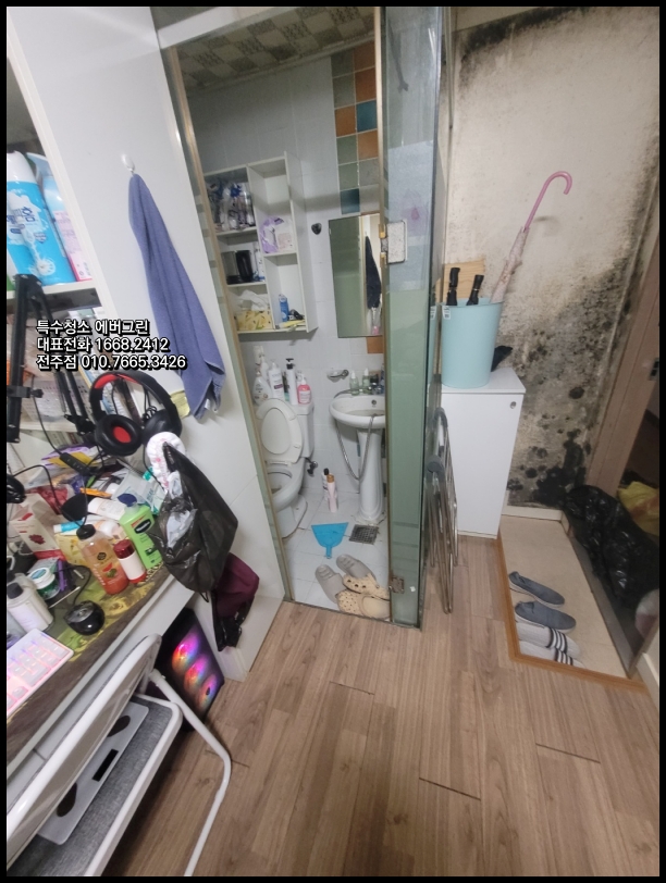 화장실 청소는 물론 공간 전체의 악취 탈취를 진행했어요. 그러면서 고객님의 생필품과 귀중품에 대한 정리도 잊지 않고 완료할 수 있었습니다.
