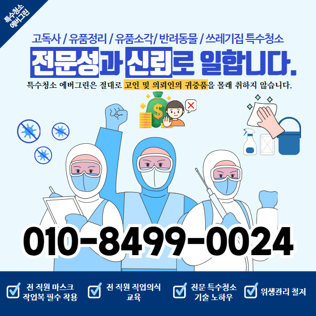 저희는 고객의 신뢰를 매우 중요하게 여깁니다. 직원들에게 귀중품 편취 예방 교육을 실시해 고객의 재산을 보호하고, 직업 의식을 갖추고 고객을 정중하게 대합니다. 이번 원룸 청소에서도 고객님의 소중한 물건들을 조심스럽게 다루었고, 버릴 물건과 보관할 물건을 신중하게 구분했습니다. 또한 투명한 가격 정책을 유지해 처음 제시한 견적을 끝까지 지킵니다. 작업 당일 갑작스러운 단가 인상 같은 불미스러운 일이 없도록 주의를 기울입니다. 하지만 쓰레기가 너무 많으면 폐기물 처리 비용이 현장에서 오를 수도 있습니다. 하지만 이번 청소에서는 처음 약속드린 가격으로 정확하게 서비스를 제공했습니다. 고객의 요구사항을 세심하게 듣고 반영하는 것도 저희의 중요한 원칙입니다. 이번 청소는 고객님이 요청하신 심야 시간대 청소, 특정 물건의 보관 등 세세한 요구사항들을 모두 지켰습니다. 이런 노력들이 모여 고객 만족도를 높이고, 신뢰를 쌓을 수 있다고 믿습니다. 저희는 다양한 종류의 특수 청소 서비스도 제공하고 있습니다. 쓰레기 집 청소뿐만 아니라 고독사 현장 정리, 범죄 현장 청소, 화재 현장 복구 청소 등 특수한 상황에서의 청소도 전문적으로 수행합니다. 각 상황에 맞는 전문 장비와 세제, 그리고 잘 훈련된 직원들을 투입해 안전하고 깨끗하게 청소를 마무리합니다.