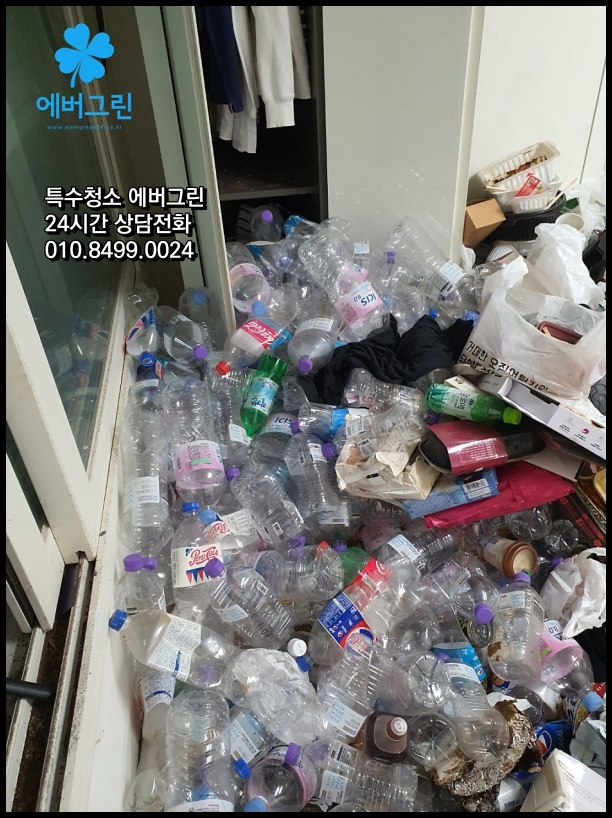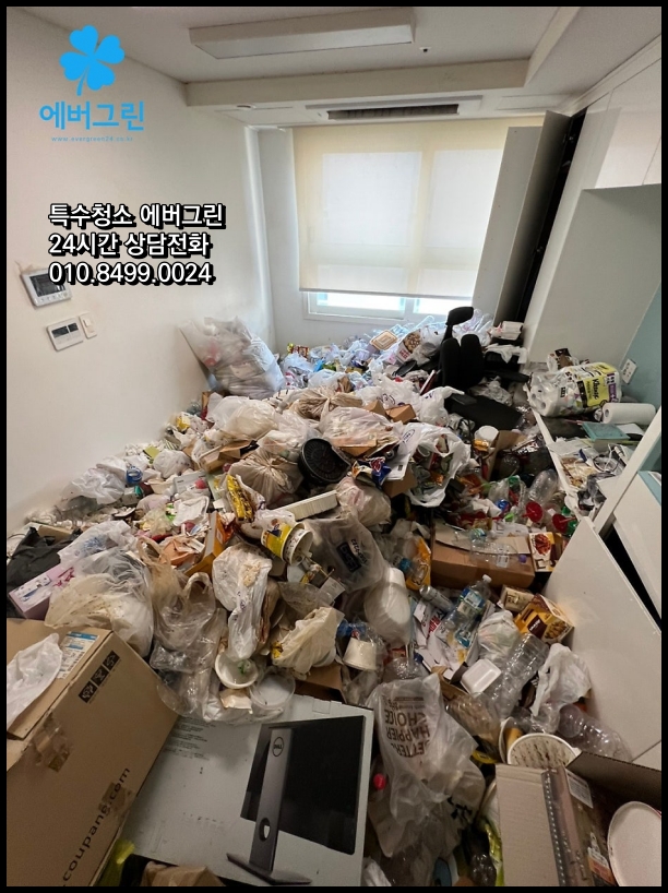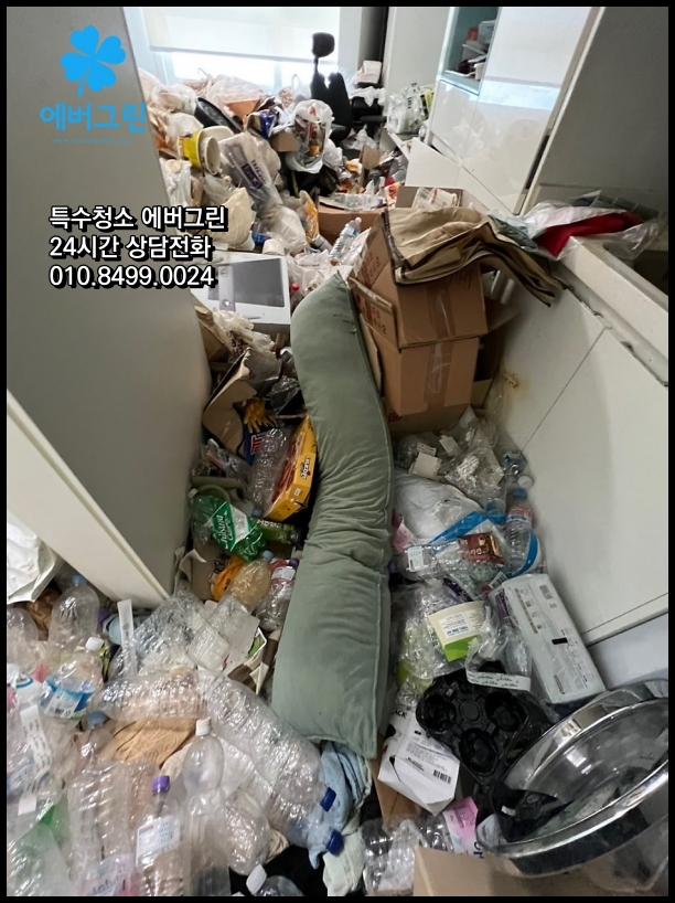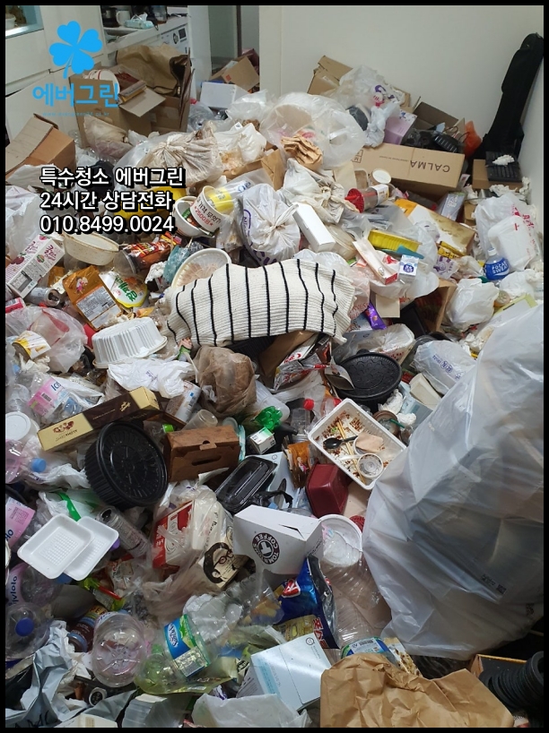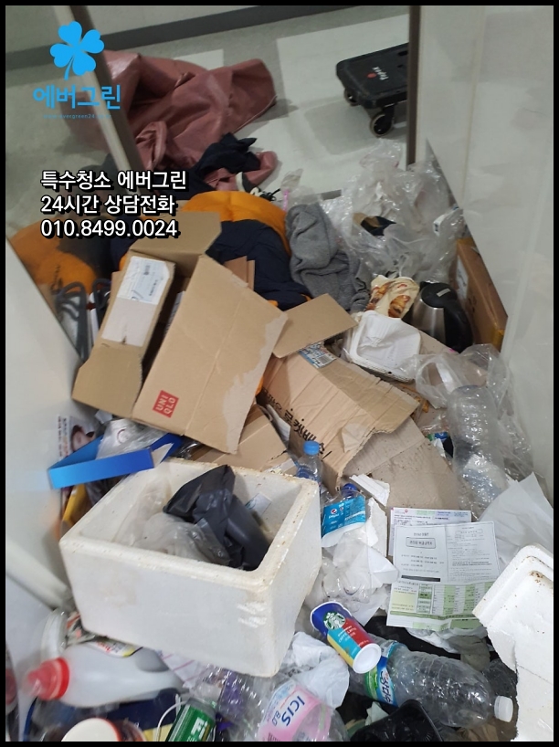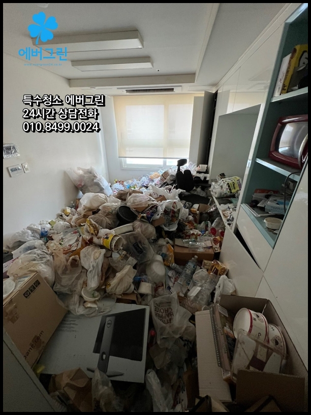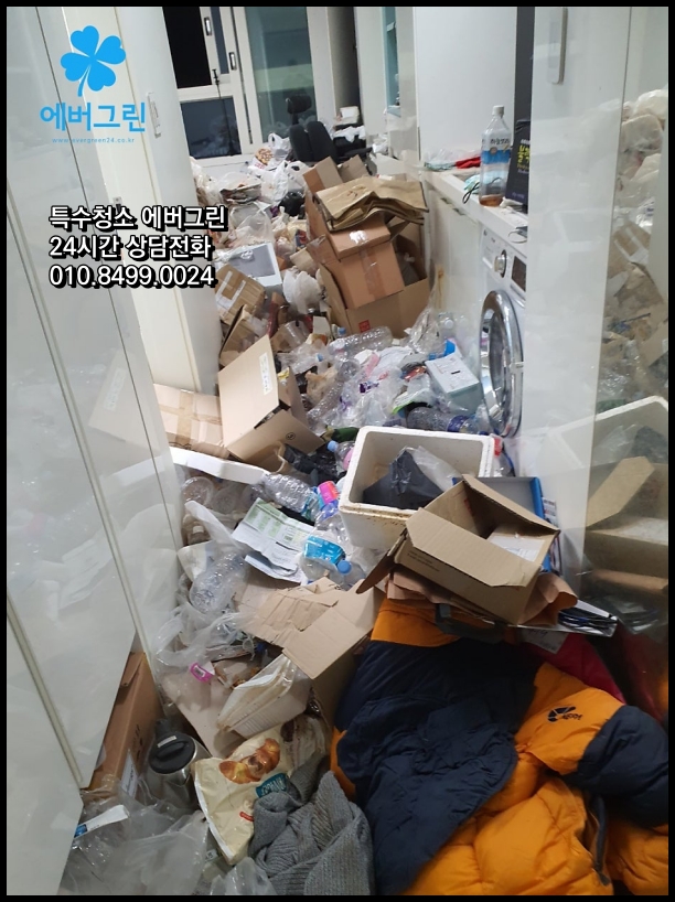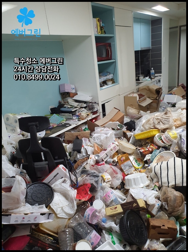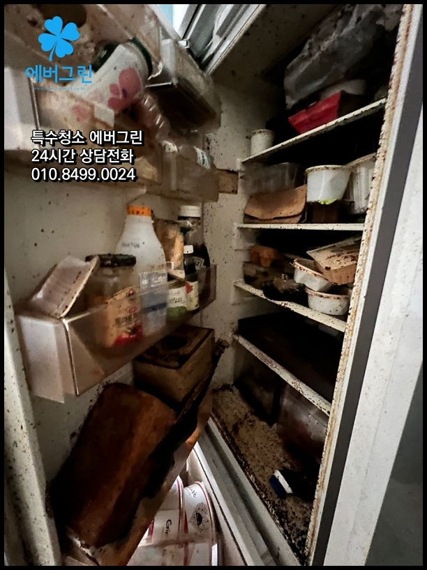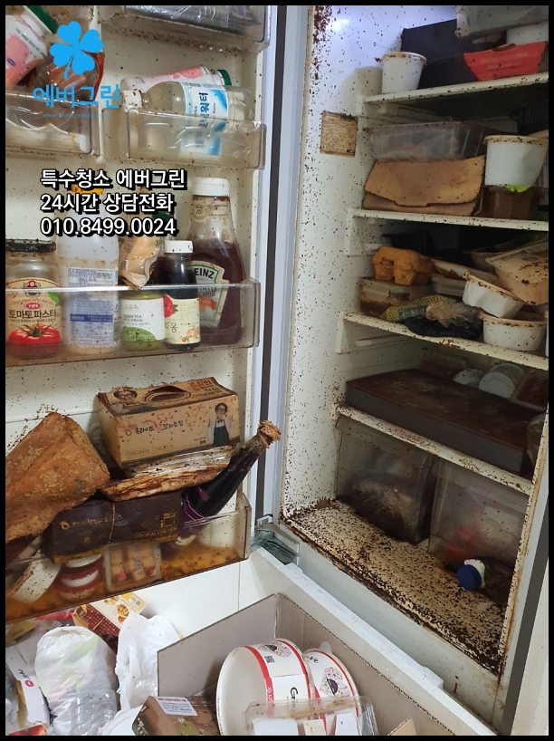 저희 에버그린은 SBS '그것이 알고싶다', KBS '더보기', KBS '시사기획 창'에 출연하며 전문성을 인정받은 특수청소 전문기업입니다. 건물위생관리업 등록증과 소독업 신고증을 보유한 공인된 업체로서, 초기 견적을 철저히 준수하며 추가 비용이 발생하지 않는 투명한 서비스를 제공합니다. 이번 현장은 임대인과의 갈등으로 이주가 필요한 의뢰인의 원상복구 요청으로 시작되었습니다. 현장 점검 결과 원룸형 풀옵션 오피스텔이었으며, 일본, 독일, 미국산 특수 세정액을 활용한 전문 청소가 필요한 상황이었습니다. 실내 전반에 생활쓰레기가 무질서하게 쌓여있었고, 부패된 음식물 쓰레기로 인한 악취가 심각했으며, 냉장고 내부는 극심한 오염 상태였습니다.