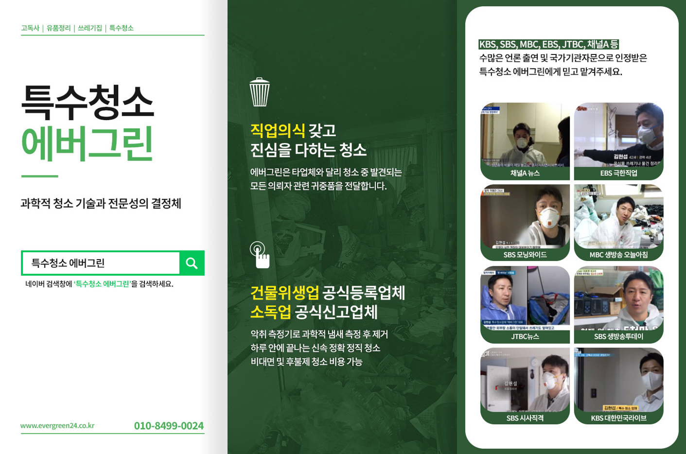 저희 에버그린은 SBS '그것이 알고싶다', KBS '더보기', KBS '시사기획 창' 등 국내 유수의 시사 프로그램을 통해 검증된 전문 청소 업체입니다. 일본, 독일, 미국의 선진 세정제를 도입한 과학적 청소 방식으로 일반 청소로는 해결하기 어려운 현장을 복원하고 있습니다. 건물위생관리업 등록증과 정부 공인 소독신고증을 보유한 적법한 사업자로서, 중범죄 현장의 혈흔 처리부터 고독사 현장 정리까지 폭넓은 전문 청소 경험을 보유했습니다. 이지화재복구와의 협업으로 화재 복구 공사도 수행하며, 전문 손해사정사와 행정사를 통한 행정 절차 지원도 제공합니다.