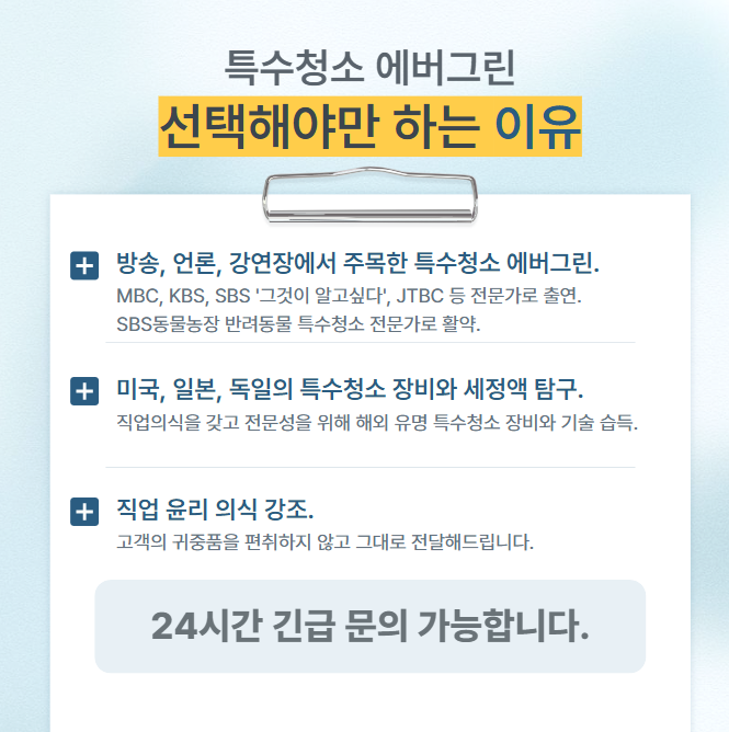 특수청소 분야는 성장을 거듭하고 있으나, 전문성 부족으로 어려움을 겪는 사례가 늘고 있습니다. 현장 기술뿐 아니라 고객 관리, 인력 운용, 행정 실무까지 폭넓은 역량이 요구되기 때문입니다. 에버그린은 건물위생관리업 등록증과 정부 공인 소독신고증을 보유한 인증 기업으로서, 현장의 실전 노하우를 전수합니다. 특히 유족의 심리적 케어와 이웃 민원 예방을 위한 현장 관리 기법은 이 분야에서 가장 중요한 전문성 중 하나입니다. 앞으로도 에버그린은 믿음과 전문성으로 특수청소 분야의 새로운 장을 열어가겠습니다. 특수청소 전문가를 꿈꾸시는 분들의 교육 문의를 환영합니다. 감사합니다.