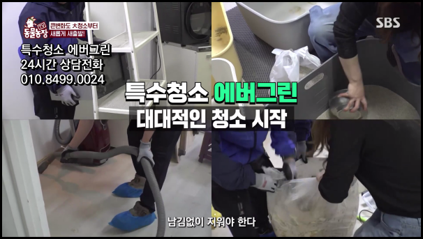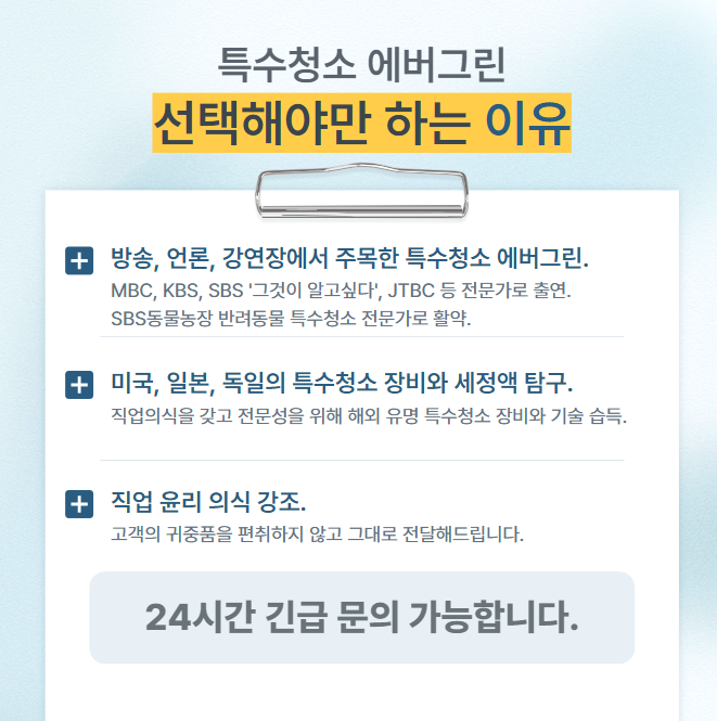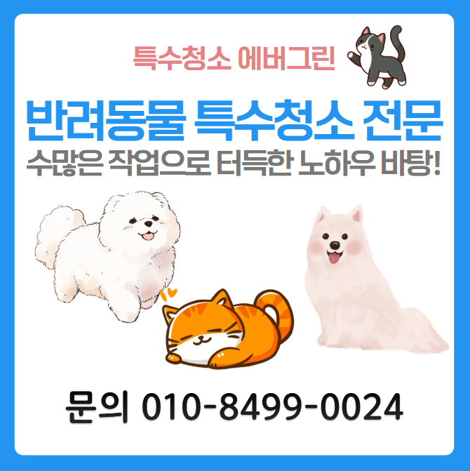 서울, 인천, 경기를 중심으로 한 수도권은 물론, 전주, 대전, 세종, 광주, 부산, 창원, 김해, 마산, 강원도 전 지역까지 24시간 내 출동이 가능한 서비스를 제공합니다. 건물위생관리업 등록증과 정부 인정 소독신고증을 보유한 합법적 업체로서, 국내 대기업 연구원 사택과 관공서 실적을 보유한 전문 인력만이 서비스를 제공합니다. 청소의 성공은 세 가지 요소에 달려있습니다. 숙련된 전문 인력, 고품질 세정액, 그리고 첨단 장비가 그것입니다. 저희 에버그린은 이 세 가지를 모두 갖춘 특수청소 전문기업입니다. 이번 SBS 동물농장 방송에서 보신 것처럼, 고객님의 소중한 반려동물과 주거 환경을 위한 최적의 솔루션을 제공해드리겠습니다. 지저분한 공간을 쾌적하고 건강한 환경으로 탈바꿈시키는 일, 저희 특수청소 에버그린이 책임지겠습니다. 반려동물로 인한 특수청소가 필요하시다면 지금 바로 연락주세요. 전국 어디서나 24시간 내에 출동하여 최상의 서비스를 제공해드립니다.